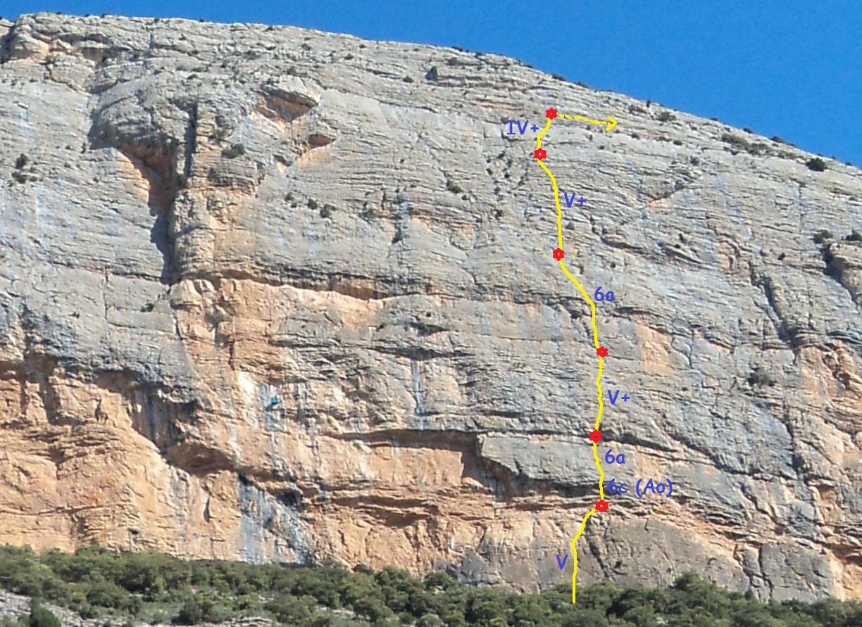 - Dificultat: 6b+ (V+/A1) (MD+)